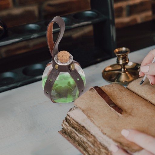 Butelki z korka i uchwyt na pasek ze sztucznej skóry to dobre połączenie, które pomoże dodać klimatu kostiumowi czarownicy lub czarodzieja.