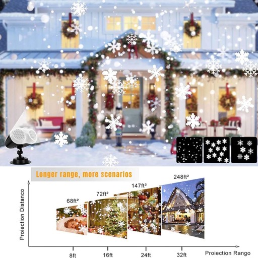 - ▲ULEPSZONE ŚWIATŁA PROJEKTORA ŚNIEGU: Projektor opadów śniegu ma podwójne lampy LED projektora, które przyjmują źródło światła LED o wysokiej jasności, o większym zasięgu i tworzą bardziej realistyczne, żywe i piękne wirtualne płatki śniegu niż inne monokularowe lampy projekcyjne.