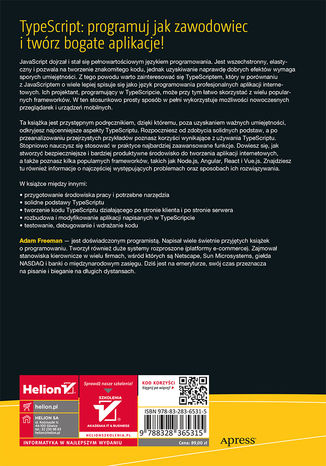 Ta książka jest przystępnym podręcznikiem, dzięki któremu poza uzyskaniem ważnych umiejętności odkryjesz najcenniejsze aspekty TypeScriptu. Rozpoczniesz od zdobycia solidnych podstaw, a po przeanalizowaniu przejrzystych przykładów poznasz korzyści wynikające z używania TypeScriptu. Stopniowo będziesz się uczyć stosować w praktyce najbardziej zaawansowane funkcje. Dowiesz się, jak stworzyć bezpieczniejsze i bardziej produktywne środowisko do tworzenia aplikacji internetowych, a także poznasz kilka popularnych frameworków, takich jak Node.js, Angular, React i Vue.js. Znajdziesz tu również informacje o najczęściej występujących problemach oraz sposobach ich rozwiązywania.