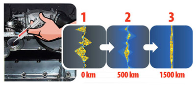 - Po pokonaniu odcinka 200 km lub po 4-ech godzinach na biegu jałowym można jeździć bez ograniczeń prędkości. Tworzenie warstwy ceramiczno-metalowej trwa jeszcze do 1500 km przebiegu, ale już w normalnych warunkach eksploatacji. W tym czasie nie wymieniać oleju!