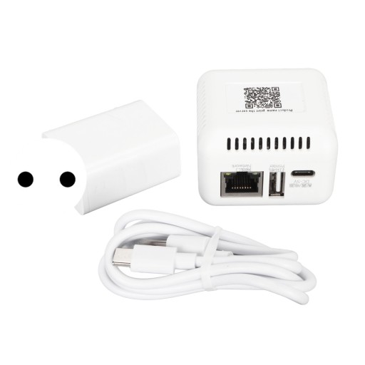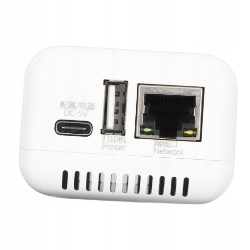 2. WIELE INTERFEJSÓW: Adapter serwera druku komputerowego z portem zasilania typu C, portem połączenia USB drukarki i interfejsem kabla sieciowego.