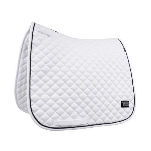 Klasyczny czaprak wykończony srebrnym pipingiem, podszyty oddychającym i łatwym w praniu podszyciem z siateczką.