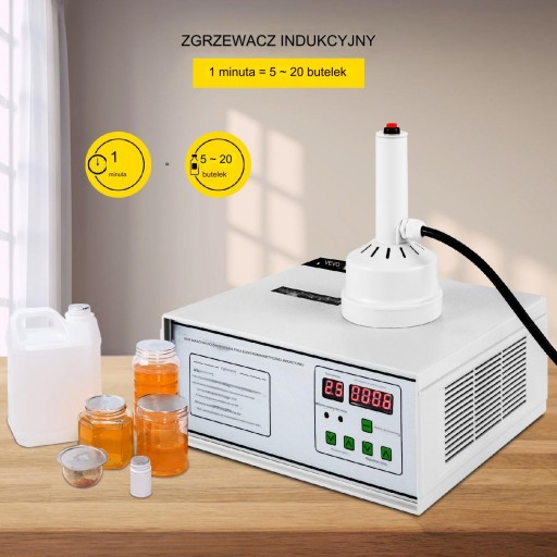 - Zgrzewarka indukcyjna o mocy 500 W, idealna do szybkiego i skutecznego zamykania butelek folią aluminiową.
