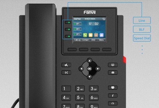 Fanvil X303P posiada trzy klawisze funkcyjne. Domyślnie są przypisane do kont SIP natomiast można używać tych klawiszy np. jako BLF czyli podgląd dostępności pracowników lub szybki kontakt do innego wewnętrznego/zewnętrznego numeru.
