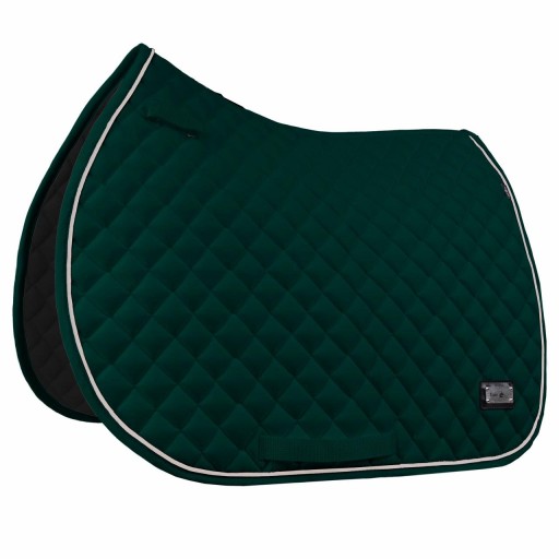 Klasyczny czaprak wykończony srebrnym pipingiem, podszyty oddychającym i łatwym w praniu podszyciem z siateczką.