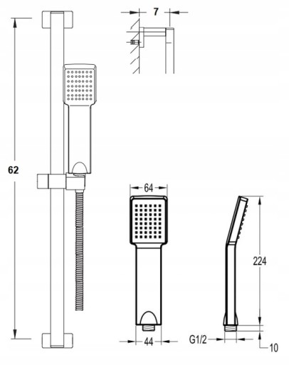 1/ długość drążka 64 cm 2/ wysokość słuchawki regulowana 3/ strumień deszczowy