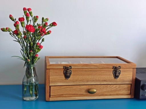 Komódka na 16 zegarków z miejscem na przyrządy, bransoletki i paski. Elegancka i funkcjonalna, w całości ręcznie robiona, wykonana z długo sezonowanej, starej, ciemnej, pięknej dębiny. Wykonanie z pełnego drewna, szlifowanego, olejowana olejem naturalnym, ekologicznym. Ta skrzyneczka posłuży lata. Solidne zawiasy i zapięcie idealnie pasują do rustykalnego stylu całości. Kieszonki na zegarki są duże i głębokie, świetnie zabezpieczają zegarki przed uszkodzeniem oraz porysowaniem przez np. koronkę sąsiada, wygodnie zmieszczą się zegarki o szerokości nawet 55 mm! Szkło w wieczku skrzyneczki jest grube, hartowane dzięki czemu ma podniesioną odporność na stłuczenia i porysowanie. Warto popatrzeć na szczegóły wykonania. Pudełko i szuflady są podklejone filcem. Dno skrzyneczki zostało wylożone takim samym materiałem, z któego wykonane są poduszki.
