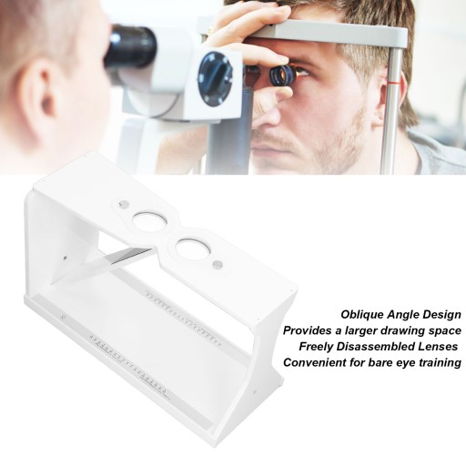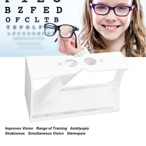 - Cel: Rozdziela pole widzenia po obu stronach za pomocą pryzmatu, na pryzmacie zamocowane jest płaskie lustro odbijające. Oko dominujące patrzy na uchwycony cel wizualny lub obraz wizualny umieszczony na płycie bocznej, odbijając się od zwierciadła płaskiego. Sygnał jest przesyłany do drugiego oka (tj. oka niedowidzącego zwróconego w stronę bezpośredniego otworu) przez mózg i jest rzutowany na dolną płytkę. Następnie na dolnej płycie ćwiczy się łapanie, rysowanie i łączenie obrazów, aby poprawić widzenie, wyeliminować tłumienie i ustalić jednoczesne widzenie i stereopsję u pacjentów z niedowidzeniem lub zezem, co daje dobre efekty.