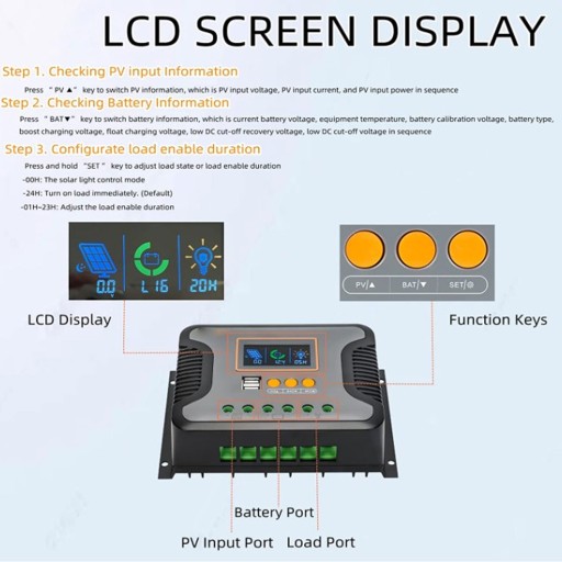 3. 3-STOPNIOWA TECHNOLOGIA PWM: Kontroler ładowania jest wyposażony w zaawansowaną inteligentną technologię PWM, posiada wysoką wydajność ładowania, poprzez trzystopniowy tryb ładowania (ładowanie masowe, boost, ładowanie płynne), szybkie, wydajne i bezpieczne ładowanie akumulatora, skutecznie wydłuża żywotność akumulatora ; W połączeniu ze sterowaniem światłem słonecznym i sterowaniem czasowym, czas włączenia obciążenia można dowolnie regulować
