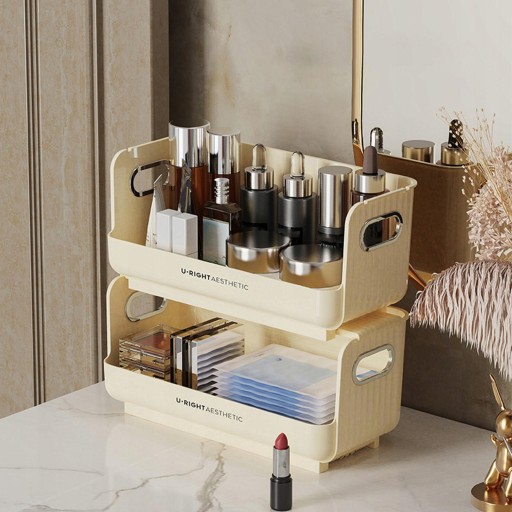 [Pojemnik do układania w stos]: pojemnik do przechowywania toaletki, duża pojemność, można układać w stosy do przechowywania, dzięki czemu twój pulpit jest uporządkowany i schludny, wygodny i praktyczny. Duży otwór, łatwy do założenia i dostępu. Z uchwytami po obu stronach, łatwe do przenoszenia.