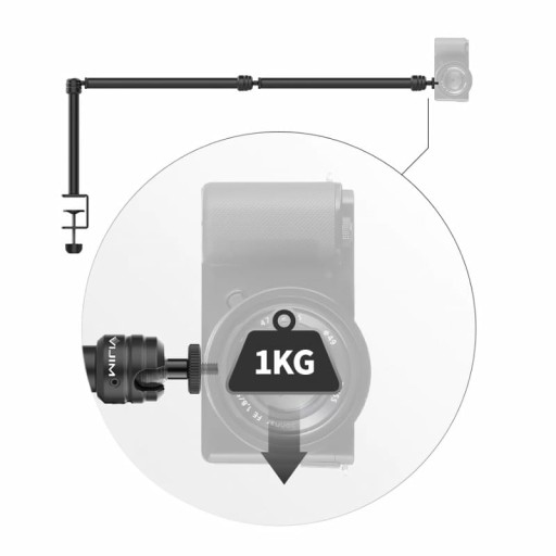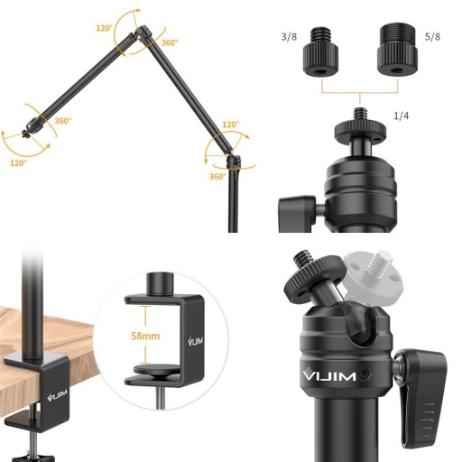 Uniwersalny statyw dzięki któremu umieścisz lampę, aparat, mikrofon, lub oświetlenie studyjne na blacie biurka. Długie ramię pozwala ustawić sprzęt jak ci wygodnie. Możesz na nim umieścić aparat np. obiektywem w dół albo ponad swoimi notatkami czy ekranem komputera.