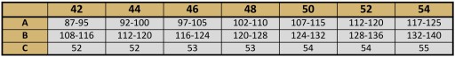 A - Obwód w pasie (wymiar podany w tabeli to zakres przy rozciągnięciu gumy)