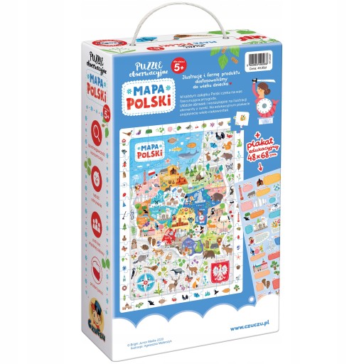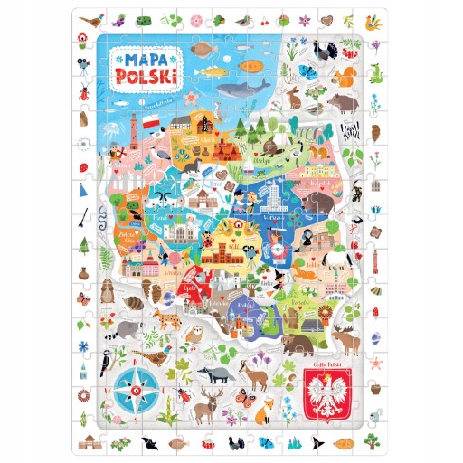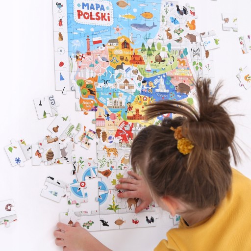 Na poszczególnych elementach znajdują się kolorowe i szczegółowo dopracowane ilustracje, na które dzieci bardzo często zwracają uwagę. Umieszczono na nich wszystkie symbole naszego kraju - zarówno słynne budowle i zabytki, jak i gatunki zwierząt, które żyją w Polsce. Nie zabrakło także treści wyróżniających poszczególne regiony. Dzięki takiej różnorodności kilkulatek pozna swój kraj od każdej możliwej strony i zdobędzie cenną wiedzę historyczną i geograficzną.