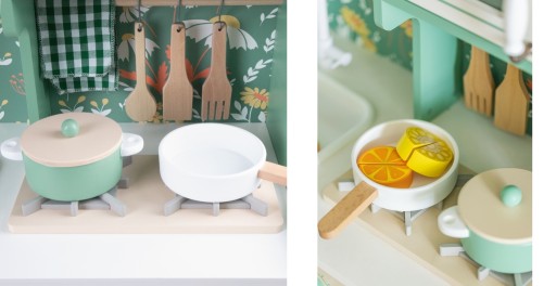 - W zestawie 15 sztuk kuchennych akcesoriów – patelnia, garnek z pokrywką, filiżanka, solniczka, pieprzniczka, 3 łyżki kuchenne, haczyki do zawieszenia przyborów, ściereczka
