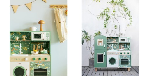 Przepiękna kuchnia od marki CLASSIC WORLD to świetna propozycja dla dzieci które lubią wcielać w różne role osób dorosłych podpatrzonych w życiu codziennym. Ta drewniana kuchnia do zabawy jest w przeważającej części zielona z pięknymi kwiatowymi wzorami, dzięki czemu dzieci mogą cieszyć się klasycznym stylem retro. Zestaw zawiera wiele obszarów funkcjonalnych, takich jak zlew, kuchenka, szafki i zmywarka oraz wiele innych. Po lewej stronie znajduje się tablica, po której dzieci mogą pisać. Na kuchence natomiast można symulować gotowanie, zyskując niesamowite wrażenia kulinarne