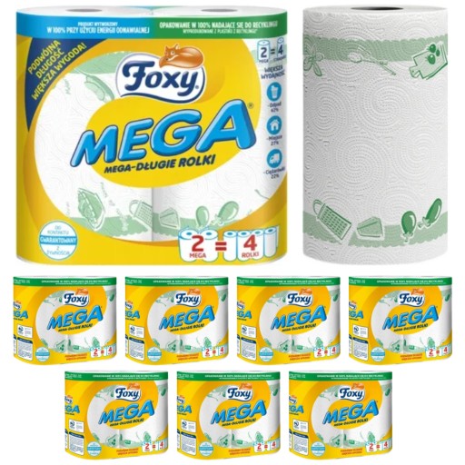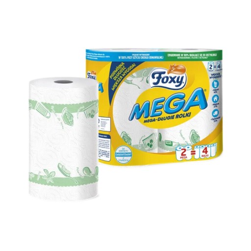Dwie duże rolki Foxy Mega odpowiadają 4 rolkom standardowego ręcznika. Specjalnie zaprojektowane wytłoczenie papieru powoduje idealnie równomierne wchłanianie wody.