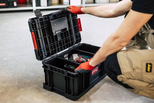 Modularna, wytrzymała skrzynka narzędziowa z poliamidowymi zapięciami i solidną rączką.