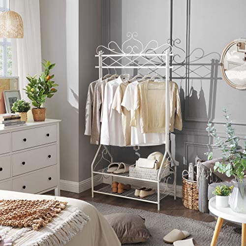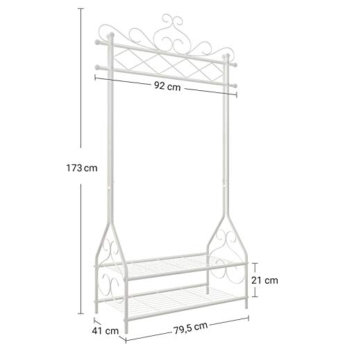 Wizualny akcent w Twoim domu, z zakrzywionymi dekoracjami na górze i na dole, wieszak w stylu vintage ozdobi Twój korytarz, garderobę, sypialnię itp. Łączy drążek na ubrania i półki w jedną ramę. Na górze można powiesić ubrania, czapki i torby; buty i pudełka są umieszczone na 2 dużych półkach. Łatwy w transporcie i oszczędzający miejsce. Górny słupek ma maksymalne obciążenie 25 kg, każda dolna półka 10 kg. Dzięki wymiarom 92 x 173 x 41 cm (szerokość x wysokość x głębokość) metalowy wieszak na ubrania zmieści się w każdym rogu. Stabilny: 4 antypoślizgowe nóżki z regulacją wysokości zapewniają stabilność nawet na lekko nierównej podłodze; 2 pionowe pręty na stronę zwiększają stabilność. Łatwy w montażu. Każdy element jest numerowany. Dołączone ilustrowane instrukcje pomogą Ci go złożyć (nie gwarantujemy znajomości języka angielskiego). Dane techniczne: - Kolor: kremowy - Materiał: rurki żelazne malowane proszkowo - Rozmiar produktu: 92 x 41 x 173 cm (szer. x gł. x wys.) - Rozmiar pojedynczej półki: 76 x 40 cm (szer. x gł.) - Waga produktu: 5,6 kg - Nośność szyny do zawieszania: 25 kg - Nośność pojedynczej półki: 10 kg Zawartość opakowania: - 1 x wieszak na ubrania - 1 x instrukcja (EN, DE, FR, ES, IT)
