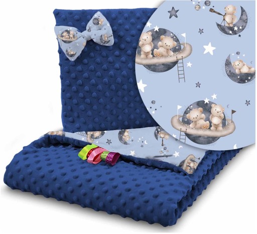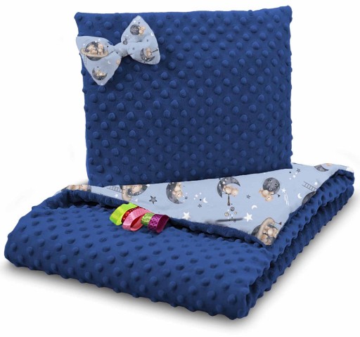 Komplet jest dwustronny: zarówno poduszka, jak i kocyk są dwustronne z jednej strony milutki materiał minky, z drugiej bawełna w różnych wzorach.