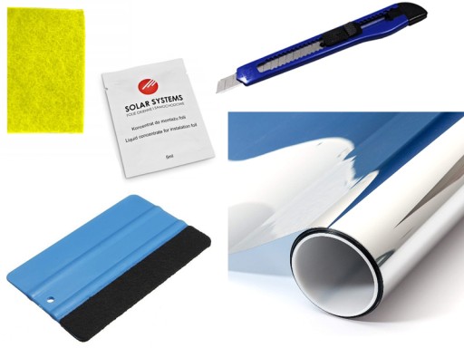 Folia okienna przeciwsłoneczna na szybę - okno. Termoizolacyjna, zewnętrzna folia lustrzana SOLAR SILVER 20XC w rozmiarze 50 x 75 cm + kompletny zestaw do aplikacji folii.