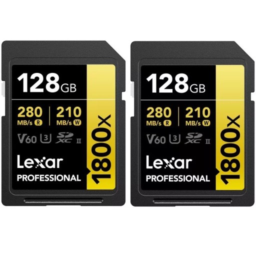 Dwupak kart LEXAR Professional 1800x SDXC U3 (V60) UHS-II o pojemności 128GB oraz prędkości odczytu 280MB/s i zapisu 210MB/s