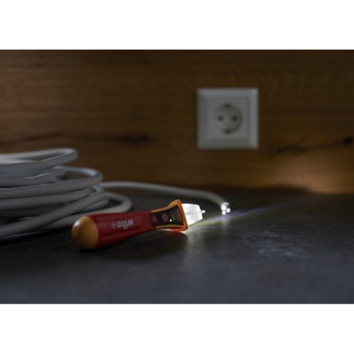 - Pierwsze wskazanie, czy nie ma napięcia, jest możliwe przy użyciu bezdotykowego próbnika napięcia Wiha dzięki sygnałowi optycznemu i akustycznemu.
