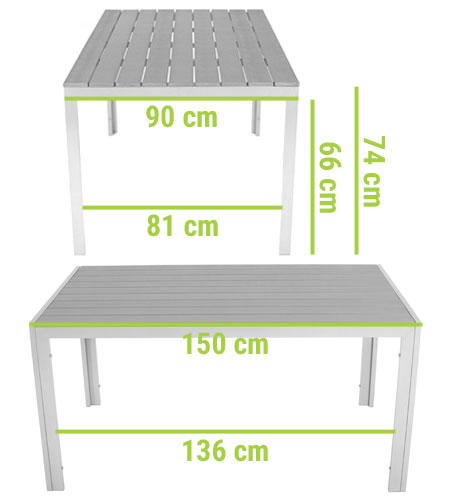 Blat stołu ogrodowego składa się z desek kompozytowych WPC wykonanych z polistyrenu PS. Jest odporny na uszkodzenia i łatwy w czyszczeniu, wystarczy go przetrzeć wilgotną ściereczką.