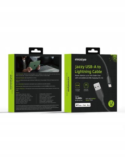 - Jak długo kabel wytrzyma intensywne codzienne użytkowanie - Nasz kabel Innostyle Jazzy jest wyposażony w wytrzymałe włókno Kevlar, co czyni go niezwykle odpornym na zginanie. Jazzy przeszedł test 15,000 zgięć. Dzięki temu jest aż 15 razy trwalszy niż standardowe kable, gwarantując Ci niezawodność i długowieczność, nawet przy najbardziej intensywnym użytkowaniu.