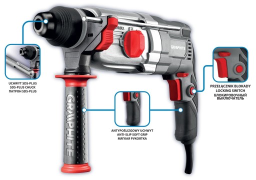 Młotowiertarka SDS+ 900 W, 3,4J, walizka 58G539 marki GRAPHITE to specjalistyczne narzędzie SDS+ o mocy 900 W, posiadające funkcje wiercenia oraz wiercenia z udarem pneumatycznym a także podkuwania i indeksacji dłuta.