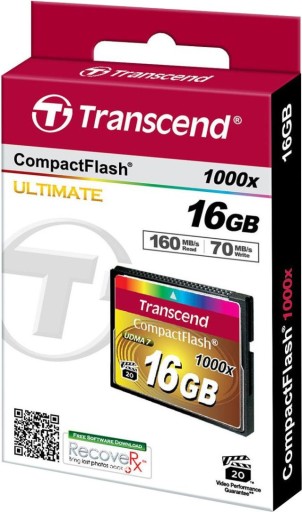 Karta pamięci Compact Flash o pojemności 16 GB, prędkości zapisu 70 MB/s, odczytu 160 MB/s.