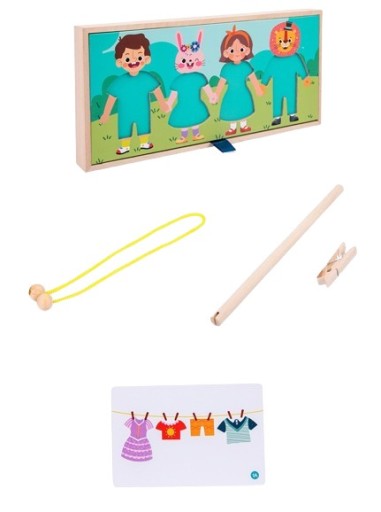 - Można też ubierać postaci w ubranka zgodnie z wykrojonym kształtem. Na podkładce znajdują się cztery postacie, które można dowolnie ubierać w kolorowe ubranka zgodnie z kształtem.