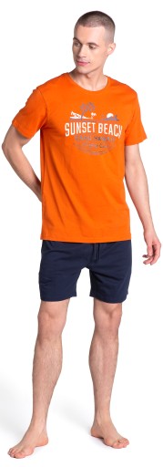Komplet piżamowy składa się z pomarańczowej bawełnianej koszulki z nadrukiem na klatce oraz granatowych gładkich spodni.