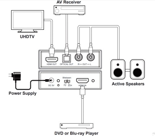 - Wyodrębnia sygnał audio z HDMI do wielokanałowego sygnału optycznego (SPDIF) lub analogowego stereo L/R