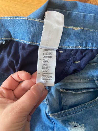 Bardzo elastyczne spodnie jeansowe z szerokimi nogawkami i przetarciami, idealnie dopasowują się do sylwetki. Zapinane na guziki. Uciągają się ok 10 cm. Rozmiar 44.