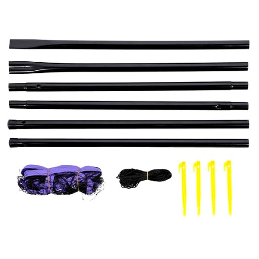 ✨Produkt montuje się wbijając do ziemi słupki, które są stelażem, a do których przywiązujemy siatkę. Zarówno siatka jak i stelaż, są odporne na warunki atmosferyczne. Długość siatki to ponad 6 m, dlatego pozwala na swobodne rozegranie, dwóch meczy jednocześnie.✨