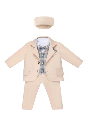 Beżowy garnitur dla chłopca to idealne połączenie klasyki oraz trendów świata dziecięcej mody. Oferowany przez nasz beżowy garnitur chłopięcy na chrzest to śliczny 6 częściowy komplecik. Garniturek składa się z takich elementów jak: