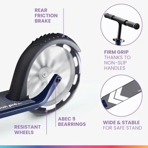 Let´s cruise! Hulajnoga FIVE od fun pro jest praktycznym towarzyszem dzięki dobrej zwrotności, w której można szybko i przyjemnie pokonywać wszystkie odległości. Kółka obracają się płynnie na łożyskach kulkowych ABEC 9 i oferują dużą przyczepność dzięki większej szerokości. Dzięki hulajnodze fun pro FIVE można bezpiecznie i zręcznie przemierzać miasto czy wieś, a także spędzać czas wolny - ponieważ jest ona idealnie dopasowana: w zależności od wzrostu można regulować wysokość kierownicy w zakresie od 88 do 106 cm. Wyjątkowy komfort i bezpieczeństwo zapewnia duża powierzchnia podestu i ergonomiczne uchwyty, a hamulec cierny zatrzyma jazdę z dużą mocą. Dodatkowa zabawa i jeszcze większe bezpieczeństwo dzięki wersji deluxe: gdy dynamo oświetla koła LED, nikt nie przeoczy Cię nawet w ciemności!