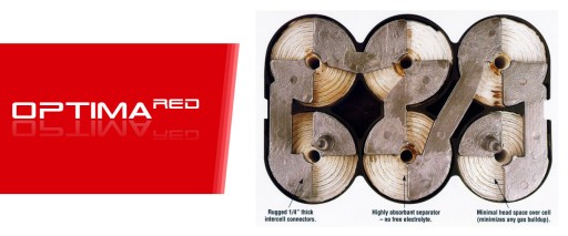 Dla porównania, w akumulatorach zastosowany jest ołów o największej czystości, który minimalizuje samoistne rozładowywanie się. Zastosowanie płyty przeciw-wibracyjnej V-Tech podnosi maksymalnie jego efektywność i sprawia, że działa on 2-3 raz dłużej niż konwencjonalne akumulatory. Są w 100% bezobsługowe. Dzięki odwracalności reakcji i szczelnej obudowie Optimy uzupełnianie poziomu elektrolitu nie jest potrzebne. Dzięki niskiemu wskaźnikowi samo rozładowania akumulator Optima, jeśli nie jest używany może pozostać przez ponad rok bez ładowania i po tym czasie nadal będzie działać niezawodnie. Czyni to z niego idealny akumulator do stosowania w maszynach sezonowych.