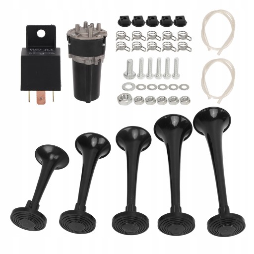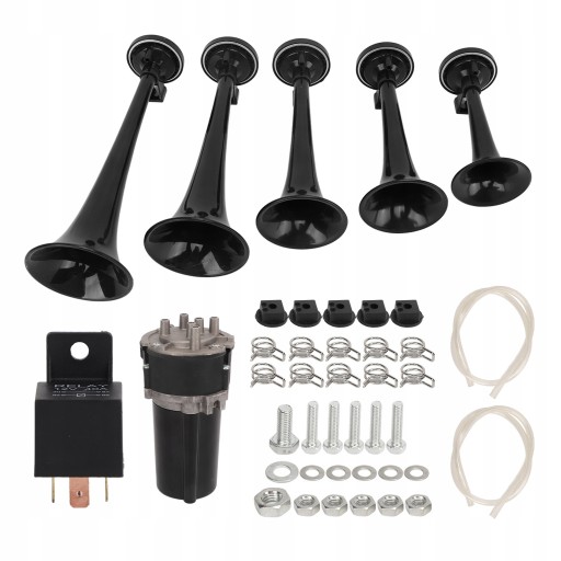4. Kompletne akcesoria: zestaw jest dostarczany z pięcioma mocnymi trąbkami, wytrzymałą sprężarką 12 V, wężem, przekaźnikiem i osprzętem montażowym, kompletne akcesoria zapewniają szybką instalację.