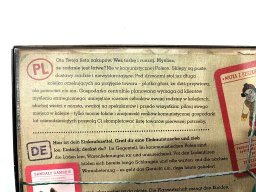 Na kartach towaru przedstawiono zdjęcia sześćdziesięciu oryginalnych przedmiotów z czasów PRL. W sklepach znajdziemy między innymi buty "Relaks", wodę toaletową "Przemysławkę", herbatę "Popularną" oraz wiele innych trudno dostępnych dóbr. Na osiedlu jest też bazar, gdzie można kupić wszystko, ale trzeba słono zapłacić. Chyba że uda się dogadać z przekupką... W tej historycznej grze planszowej trzeba nieźle kombinować, żeby zdobyć upragniony towar.
