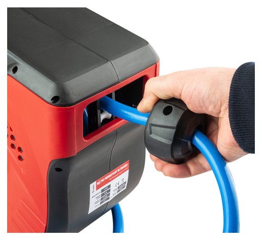 Dla Twojej wygody umieściliśmy ten wąż na specjalnym obrotowym bębnie z blokadą przed gwałtownym samoczynnym zwinięciem - rozwijasz do pożądanej długości i przewód automatycznie blokuje się na bębnie. Dzięki temu, z łatwością rozwiniesz/zwiniesz go, gdy tylko będzie taka potrzeba.