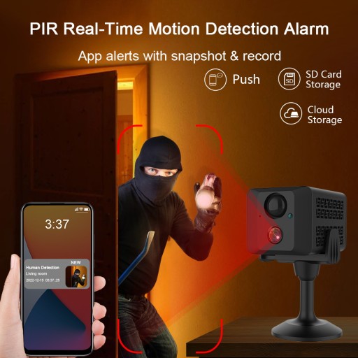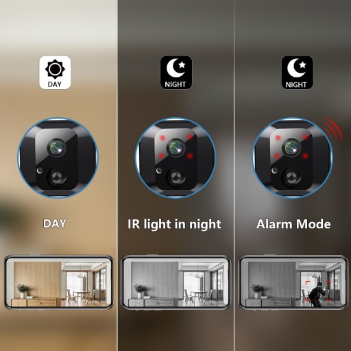 Kamera jest w stanie czuwania, gdy nie ma zmian w obrazie, a gdy ktoś wchodzi lub obraz się zmienia, kamera budzi się i rejestruje to, wysyłając wiadomość alarmową na telefon
