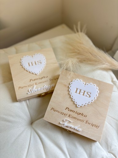 - wewnątrz pudełka umieszczone są życzenia wraz z kokardą z napisem "Komunia Święta" która pozwoli na przywiązanie pieniędzy zawiniętych w rulonik.