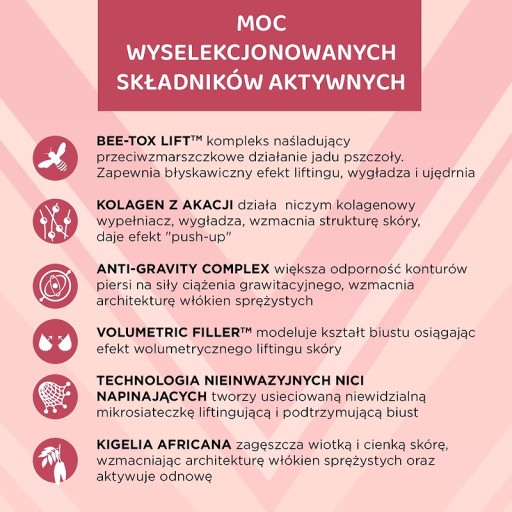 ✔️Unikalny BEE-TOX LIFTTM, kompleks zawierający syntetyczny peptyd, czerpie inspirację z działania jadu pszczoły, oferując efekt napięcia i ujędrnienia. Innowacyjna technologia nieinwazyjnych nici użyta w serum tworzy niewidzialną siateczkę, która liftinguje biust. Dodatkowo, do formuły został dodany kolagen z akacji, który wygładza i wzmacnia strukturę skóry. Ale to nie wszystko! Serum zawiera regenerujący pullulan, który chroni skórę przed wiotczeniem i wspomaga mikrokrążenie. Połączenie kofeiny i wąkroty azjatyckiej dodatkowo pobudza mikrokrążenie w skórze, redukując cellulit i ujędrniając skórę.