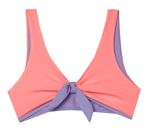 Dwuwarstwowa dzianina bez profilowanych, wyjmowanych wkładek. Wygodne, szersze ramiączka bez regulacji. Dwustronna konstrukcja, którą można nosić na kilka sposobów: top z wiązaniem na przodzie lub na ramionach oraz figi z wiązaniem po bokach lub bez (w komplecie 3 wstążki)