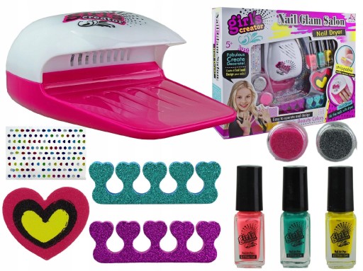Ten kolorowy zestaw z suszarką pozwala na różnorodną stylizację paznokci małych dam! Duży wybór kolorowych lakierów do paznokci, separator do paznokci i fantastyczne akcesoria do ich dekorowania sprawią, że poczujesz się jak w prawdziwym salonie kosmetycznym.