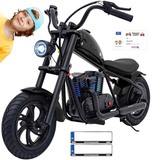Fenomenalny motor elektryczny Hyper Gogo Cruiser 12 Plus łączy oszałamiający wygląd Choppera, hipnotyzującą gamę kolorowych świateł, realistyczny efekt dymu oraz porywający dźwięk silnika. Dzięki temu gwarantuje dziecku wyjątkową radość oraz zabawę na świeżym powietrzu. Niech dzieci poznają świat wzdłuż i wszerz, ciesząc się każdą chwilą jazdy tym wyjątkowym pojazdem.