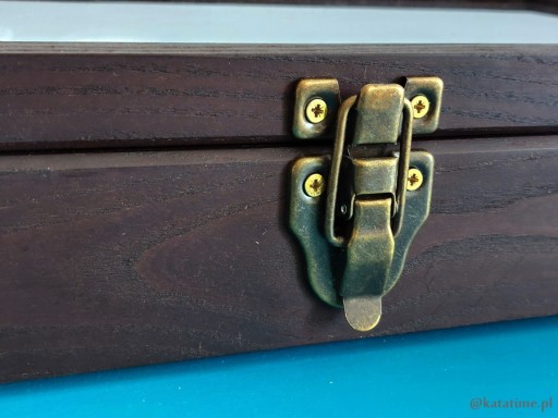 Ta skrzyneczka posłuży lata. Solidne zawiasy i zapięcie idealnie pasują do rustykalnego stylu całości. Kieszonki na zegarki są duże i głębokie, świetnie zabezpieczają zegarki przed uszkodzeniem oraz porysowaniem przez np. koronkę sąsiada, wygodnie zmieszczą się zegarki o szerokości nawet 50 mm! Szkło w wieczku skrzyneczki jest grube, hartowane dzięki czemu ma podniesioną odporność na stłuczenia i porysowanie. Warto popatrzeć na szczegóły wykonania. Pudełko jest podklejone filcem. Dno skrzyneczki zostało wyłożone płótnem tymkim samym, z jakiego zrobione są poduszki