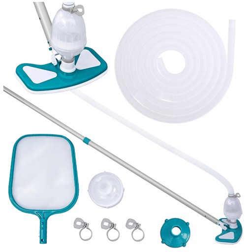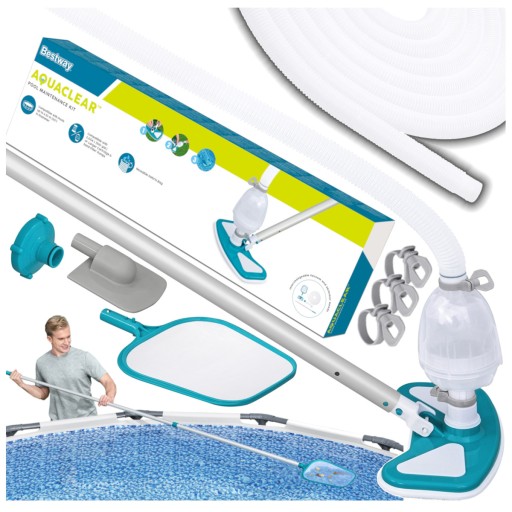 Zestaw do czyszczenia AquaClean™ firmy Bestway oferuje właścicielom basenów idealną alternatywę do ręcznego usuwania zanieczyszczeń z basenu. Po prostu przymocuj go do pompy filtrującej, a otrzymasz mocny, lekki odkurzacz, aby łatwo oczyścić ścianę i podłogi basenu.