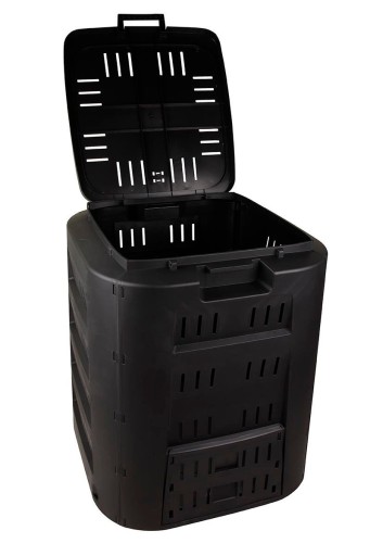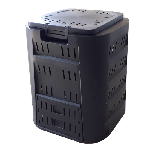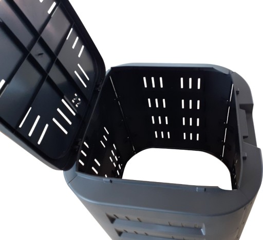 Urządzenie ma duży otwór do wsypywania odpadków organicznych, zabezpieczony pokrywą z ergonomicznym uchwytem, co chroni przed dostępem wiatru i zwierząt. Dla wygody użytkowania, na dole znajdują się dwie zasuwy ułatwiające wyjmowanie gotowego kompostu.